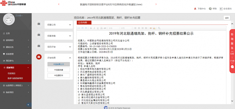 我公司于2020年6月3日 聯通入圍 ( 2019年河北聯通增高架、抱桿、鋼桿補充招募公告)