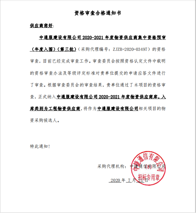 中通服建設有限公司2020-2021年度物資供應商集中資格預審(年度入圍)(第三批)