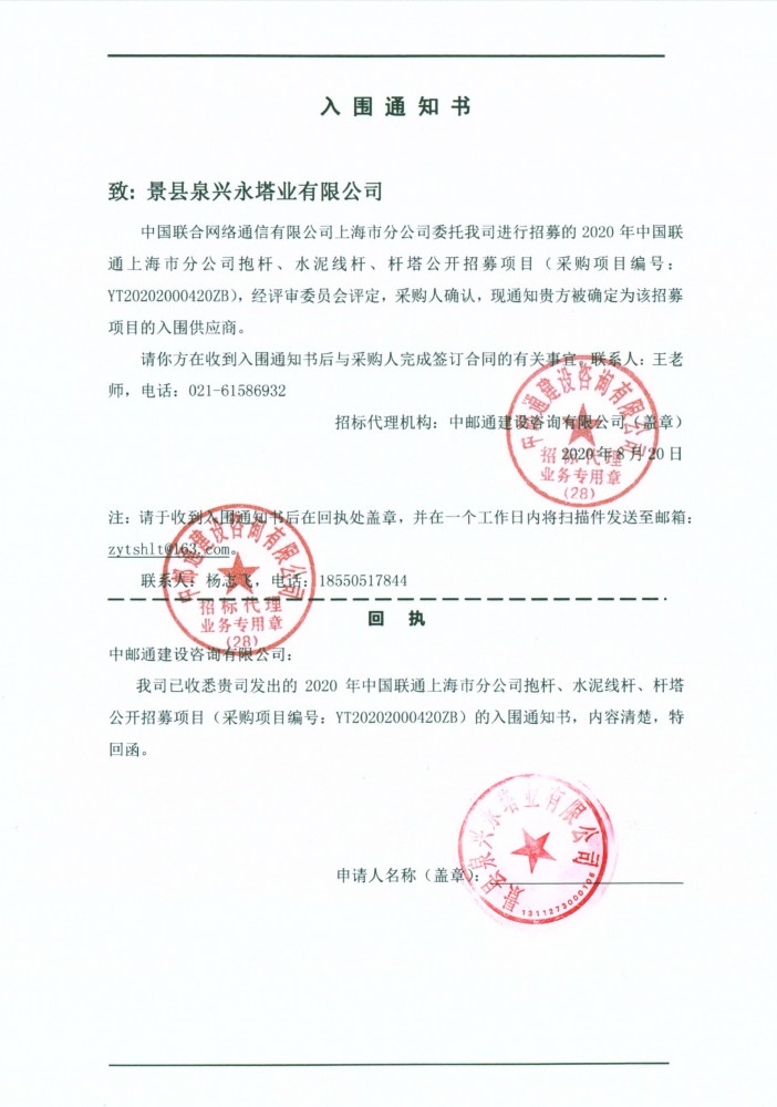 我公司于2020年8月20日收到上海聯通入圍通知書
